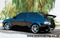 ВАЗ 2108 с оригинальным тюнингом, эта машина всего трех местная, у неё единственное место сзади зажато между колонками. У машины расширены арки, установлены 17 дюймовые диски и она тяжелее обычной машины килограмм на 200. Двигатель 1.6 форсирован до 120 лошадей, жесткая ходовая и 8-й ряд в коробке. Главная пара с отношением 4,3 и дифференциал повышенного трения. Задние тормоза кстати дисковые, но без механизма распределения тормозных усилий.