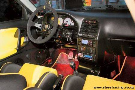 Автомобиль-чемпион получил пластиковый обвес, двухцветную окраску – в желтый и черный металлик – и кованые японские колеса Kosei с резиной Yokohama 205/40 R17. Все тормоза дисковые, ходовая часть усилена распорками, пружинами HR и амортизаторами Bilstain. Поршни двигателя облегченные, распредвал – «высокий», коробка передач – с «коротким» рядом от «Торгмаш», «дифом» повышенного трения и главной парой 3,9.